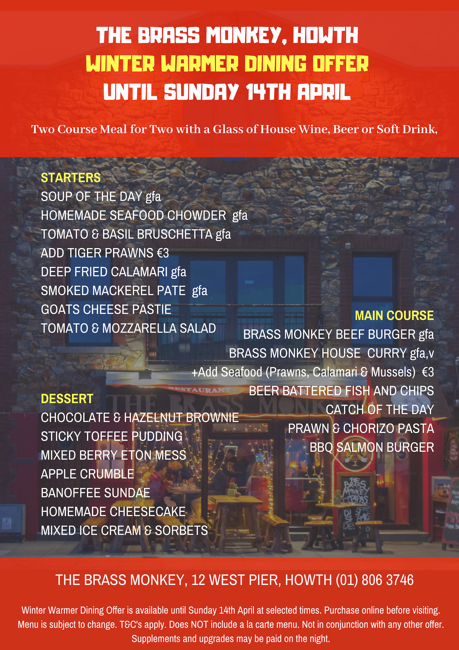 €45 Winter Warmer Dining Offer at The Brass Monkey, Howth
